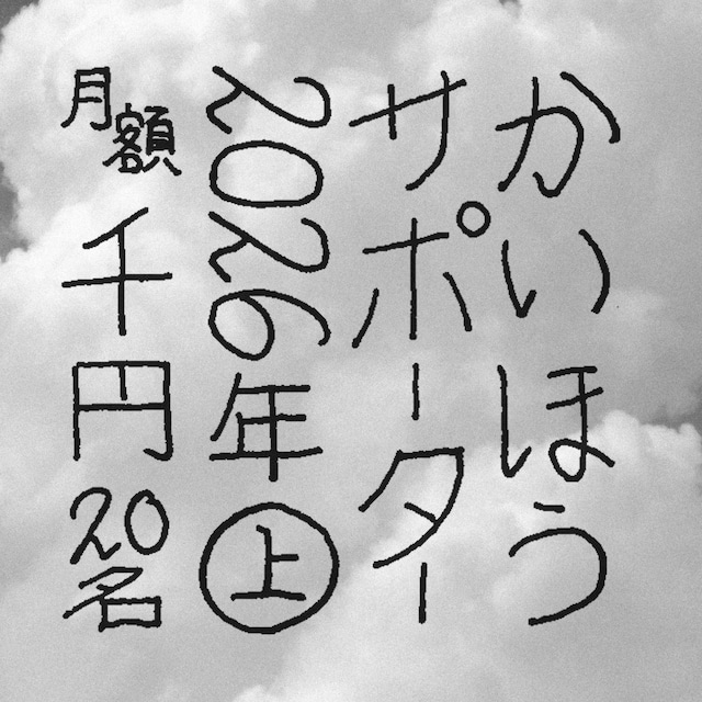 ハガキでポストに届く東郷清丸のフリーペーパー「かいほう」の有料サポーター会員を募集します。月額1,000円が6回分です。お間違えのないようご注意ください。 【内容品】 ・かいほう×6カ月 ・会員向けのお手紙「会員報」×6カ月 (いずれも2025年7月~12月号分) 会員の皆さまには、かいほうと「会員報」が同封されたものが届きます。本紙かいほうに書ききれなかったことや近況やふと思いついたことをつらつらと書く手紙のようなものです。無目的に録りためている環境音や、デモ音源、写真などその時のムードも気分で織り込まれていきます。 ※経費をまかなう程度にするため、定員は20名ほどです。(今期購読者数にあわせて少し減りました。) ※かいほう購読登録フォームからご登録いただいている方もそうでない方も、この商品を購入された発送先情報が優先されます。 - - - かいほうはフリーペーパーです。購読は無料でできます。 登録はこちら。→https://forms.gle/k1do2arGW5a2AiSM6 - - - 【上半期サポーター会員のみなさまから頂いた感想】 "東郷清丸自身が人生を使った壮大かつミニマルな自分実験室を覗き見している感覚が味わえます。面白い人ですね。"(40代/鍼灸師院長) "音楽よりも生活が記されていて、いつの間にか届く遠い知人からの生存確認報告みたいで、なんとなくうれしいです。縦書き良いっすね。また継続します。"(50代前半/会社員) "清丸さん、こんにちは。半年間、毎月会員報が届くのを楽しみにしておりました。普段はメールばかりで、物体としてのお便りが届くことがあまり無くなってしまったので、改めてお便りっていいなと思いました。アーティスト自身のことや最近どんなことに取り組んでいるのかを知りたいと思った時、通常は作品やインタビュー等の記事でしか知ることができませんが、会員報なら清丸さんご本人がお知らせしてくれる!また清丸さんが撮られた写真が素敵なので、それも楽しみです。これからも楽しみにしております!"(30代後半/会社員) "月1で届くのがちょうどよかったです。6月号の紙質が良かったです!"(30代/接客業) ”普段のちょっとしたこと、清丸さんの音楽へのアプローチの仕方など垣間見えて毎回楽しませて頂いてます。"(30代/医師)