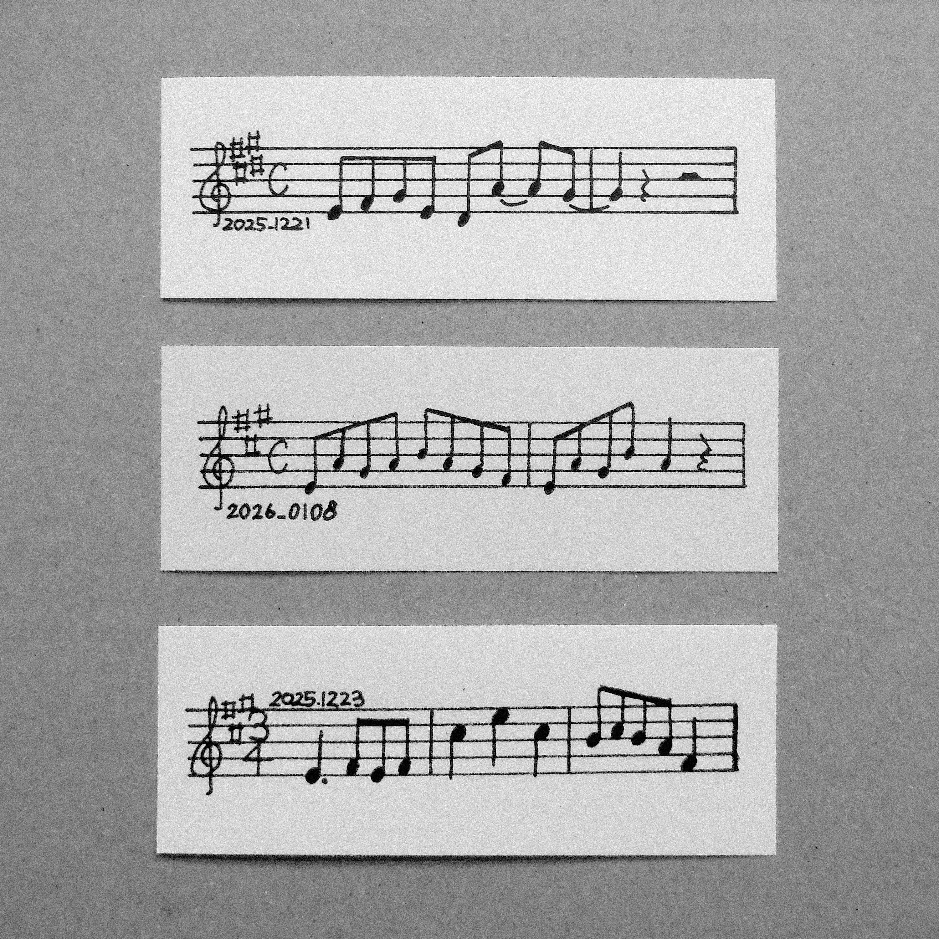 音符が記述されたしおり。エクササイズとして鼻唄を五線譜に記しているもので、数字は鼻唄を思いついた日付です。フリーペーパー「かいほう」の余り紙に印刷していますので色はさまざまです。日付や色は東郷清丸がランダムにセレクトしますので選べません。(複数購入の場合に被らないように配慮します。)